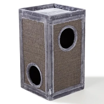 Die robust gefertigte Kratztonne von AniOne lässt sich durch ihr innovatives, dennoch schlichtem Design nahezu problemlos in jede Wohnumgebung integrieren und durch die eckige Form ideal und vor allem dadurch platzsparend in jede Zimmerecke platzieren. Die gesamte Kratztonne ist mit Natursisal umwickelt und animiert Ihre Katze dazu, ihren natürlichen Kratzisntsinkt zu befreideigen, was zugleich Ihre Möbel und Teppiche vor unschönen Kratzspuren schützt. Die beiden Höhlen laden Ihre Katze zum Spielen und ausgiebigen Verweilen ein. Die mit besonders weichem Plüsch-Stoff bezogenen Aussichtsplattform bietet Ihrer Katze einen besonder kuschilgen Platz um ihre Umgebung im Blick zu behalten.