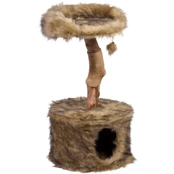 Dieser Design-Kratzbaum hebt sich von Standardmodellen vor allem durch die Verwendung eines hochwertigen Naturholzstammes ab. Dieser Kratzstamm sieht nicht nur toll aus, sondern bietet Ihrem Liebling ein naturnahes und beständiges Kratzgefühl. Jeder Stamm ist durch seine Wuchsform unterschiedlich und ein Unikat. Stellenweise ist er mit Jute umgeben, um eine optimale Krallenpflege zu unterstützen und die Dauerhaftigkeit des Kratzbaums weiter zu erhöhen. Die flauschige Liegefläche bietet Platz zum Schlafen und Relaxen und ist eine willkommene Klettermöglichkeit. Die integrierte Katzenhöhle ist zudem ein sicherer Rückzugsort und eine Oase der Gemütlichkeit. Darüber hinaus läd der Spielball Ihren Stubentiger zum Herumtoben ein. Die Holzbestandteile sind FSC®-zertifiziert, wodurch eine nachhaltige und umweltfreundliche Forstwirtschaft garantiert wird. Die Bodenplatte hat einen Durchmesser von ca. 45 cm, wobei der Kratzbaum ca. 78-88 cm hoch ist und etwa 7,2 kg wiegt.