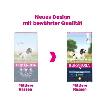 EUKANUBA Trockenfutter-Kroketten sind reich an frischem Huhn und perfekt für reife Hunde mittelgroßer Rassen im Alter von 7 bis 10 Jahren. Mit speziell ausgewählten Zutaten unterstützt das Futter das gesunde Altern Ihres reifen Hundes. Das im EUKANUBA Trockenfutter enthaltene L-Carnitin unterstützt den Abbau von Körperfett und ermöglicht Ihrem Hund, sein Optimalgewicht zu halten, was die Gelenke schont. Die maßgeschneiderte Ballaststoffmischung aus präbiotischen FOS und Rübenschnitzeln fördert eine gesunde Verdauung. Darüber hinaus sorgen EUKANUBA Kroketten mit natürlichen Omega-6- und Omega-3-Quellen für gesunde Haut und ein glänzendes Fell. Mit Glucosamin für gesunde Gelenke und Kalzium für starke Knochen. Das Futter enthält auch die Antioxidantien Vitamin E & C zur Unterstützung des Immunsystems des Hundes. Zusätzlich helfen die einzigartigen sechseckigen EUKANUBA Kroketten und das Zahnpflegesystem DentaDefense, die Zähne langfristig sauber und gesund zu halten. Das Futter ist 100 % vollwertig und ausgewogen. Eine innovative Rezeptur für reife Hunde mittelgroßer Rassen zur Unterstützung einer optimalen Körperkondition, damit sich Ihr Hund ein Leben lang wohlfühlt.