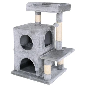 Mit diesem Katzenspielhaus aus weichem Plüsch bleiben keine Wünsche Ihrer Samtpfote offen. Die kuscheligen Höhlen laden zum Ausruhen und Verstecken ein und der hängende Plüschball sorgt für den nötigen Spielspaß. Das einladende Liegebett ist ideal für die Ruhezeiten und das Beobachten der Umgebung. Die Stämme aus robustem Sisal unterstützen die Krallenpflege und halten Ihre Katze somit von den Möbeln fern.