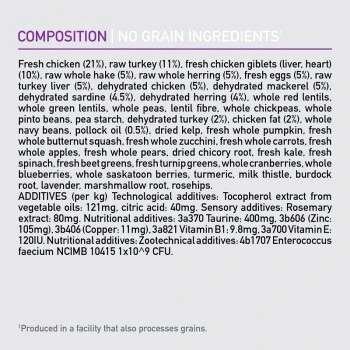 Das Hundefutter enthält 85% Fleisch und Fisch. Die Zusammensetzung folgt dem WHOLEPREY™-Prinzip, das sich am Beuteschema von in der Wildnis lebenden Hunden orientiert. Zwei Drittel der tierischen Zutaten werden frisch zubereitet, ein Drittel wird bei 90°C schonend dehydriert.